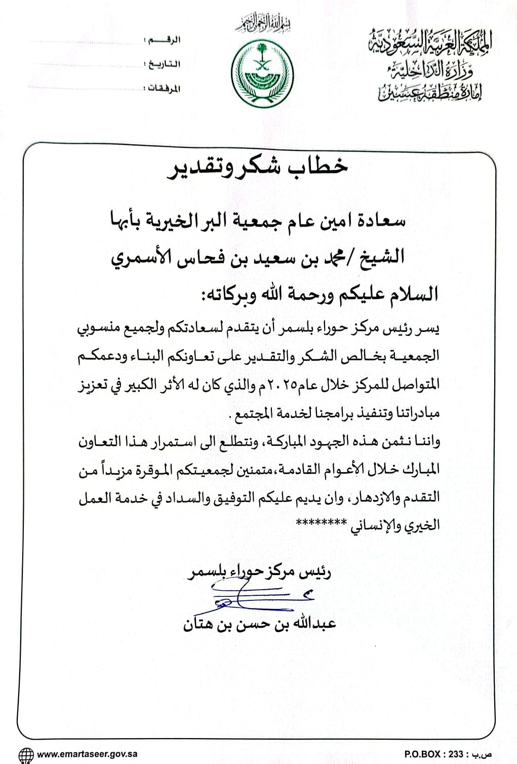 وخلال الزيارة، عبّر "بن هتان" عن شكره وتقديره لجمعية البر بأبها نظير ما تقدمه من دعم ومساندة لمركز حوراء بلسمر، مؤكدًا أن هذا الدعم أسهم في تمكين المركز من أداء رسالته وتحقيق أهدافه في خدمة فئات المجتمع.